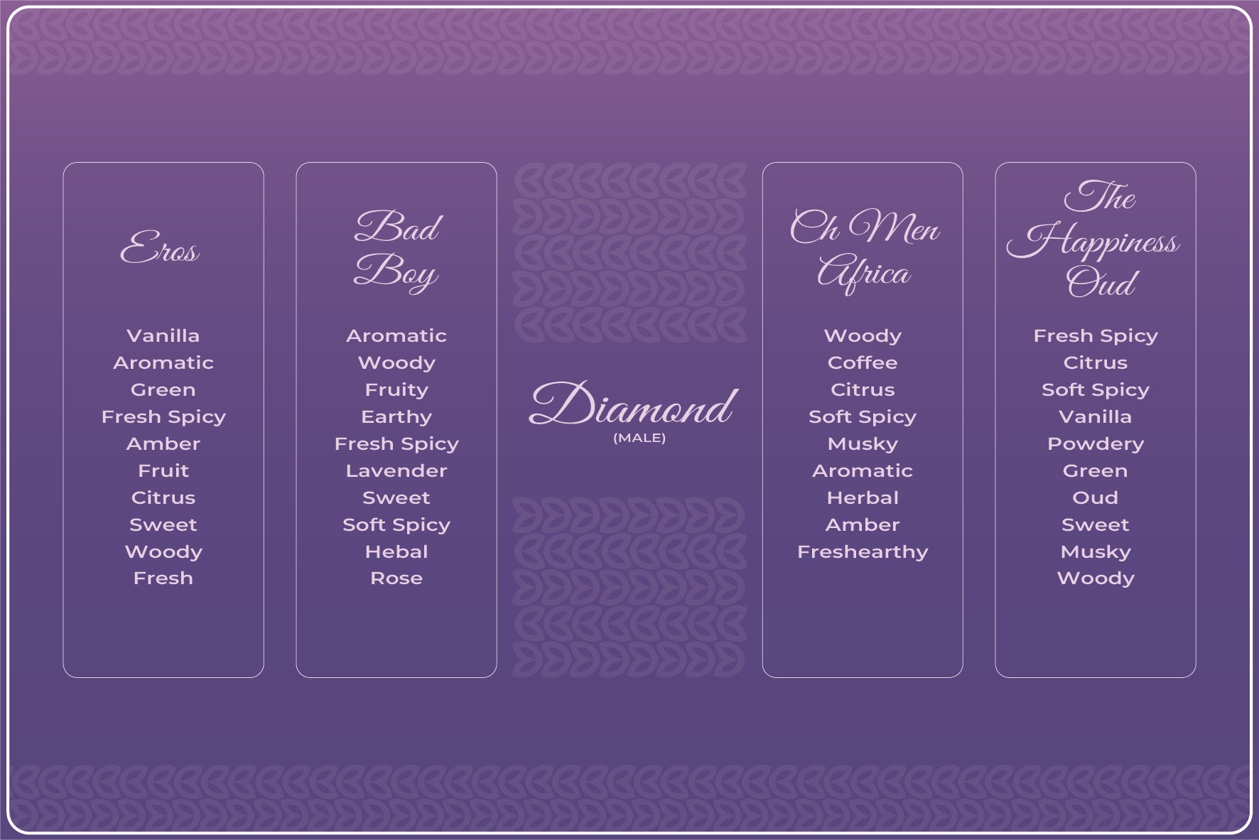 - INCLUDES INSPIRED VERSIONS OF VERSACE EROS,CH BAD BOY,CH MEN AFRICA AND INITIO OUD FOR HAPPINESS